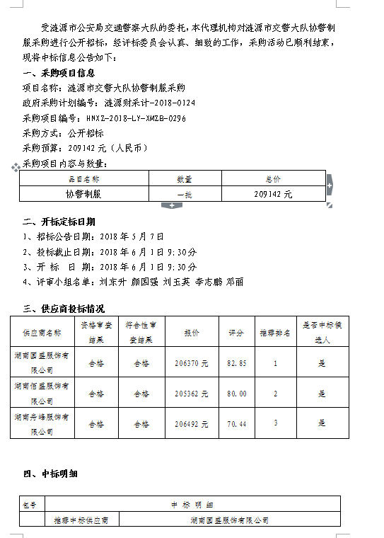 漣源市交警大隊(duì)協(xié)警制服采購(gòu)中標(biāo)結(jié)果公告