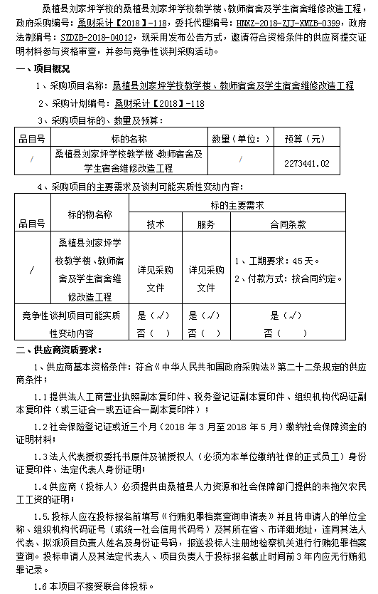 桑植縣劉家坪學校教學樓、教師宿舍及學生宿舍維修改造工程 談判公告