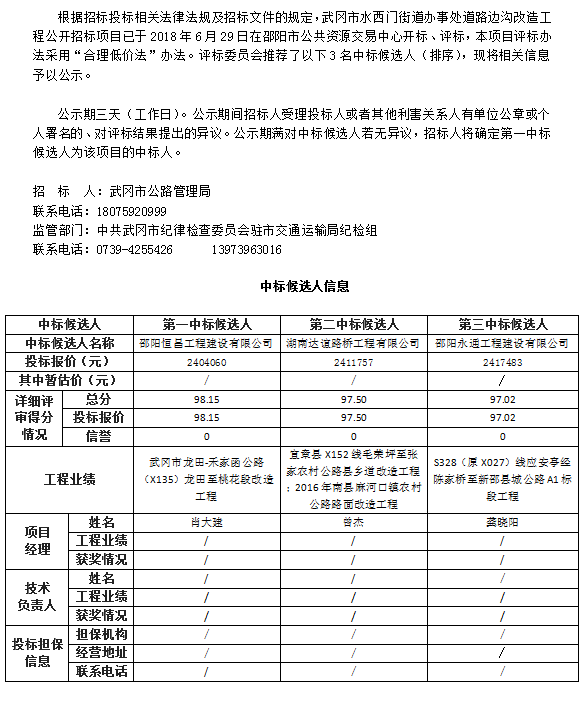 武岡市水西門街道辦事處道路邊溝改造工程 中標(biāo)候選人公示