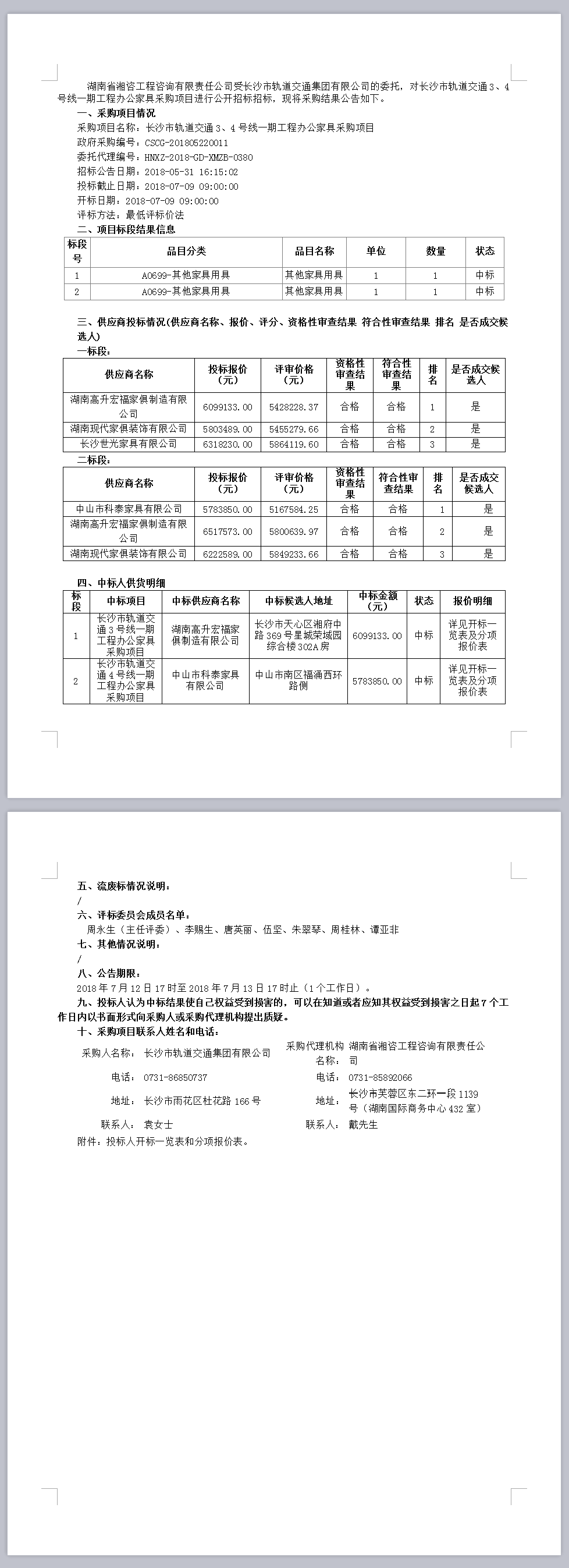 長(zhǎng)沙市軌道交通集團(tuán)有限公司長(zhǎng)沙市軌道交通3、4號(hào)線一期工程辦公家具采購(gòu)項(xiàng)目結(jié)果公告