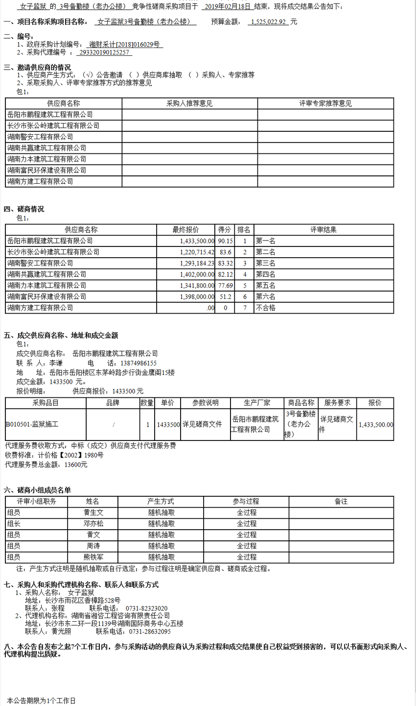 湖南省女子監(jiān)獄3號備勤樓(老辦公樓)工程  項(xiàng)目成交結(jié)果公告