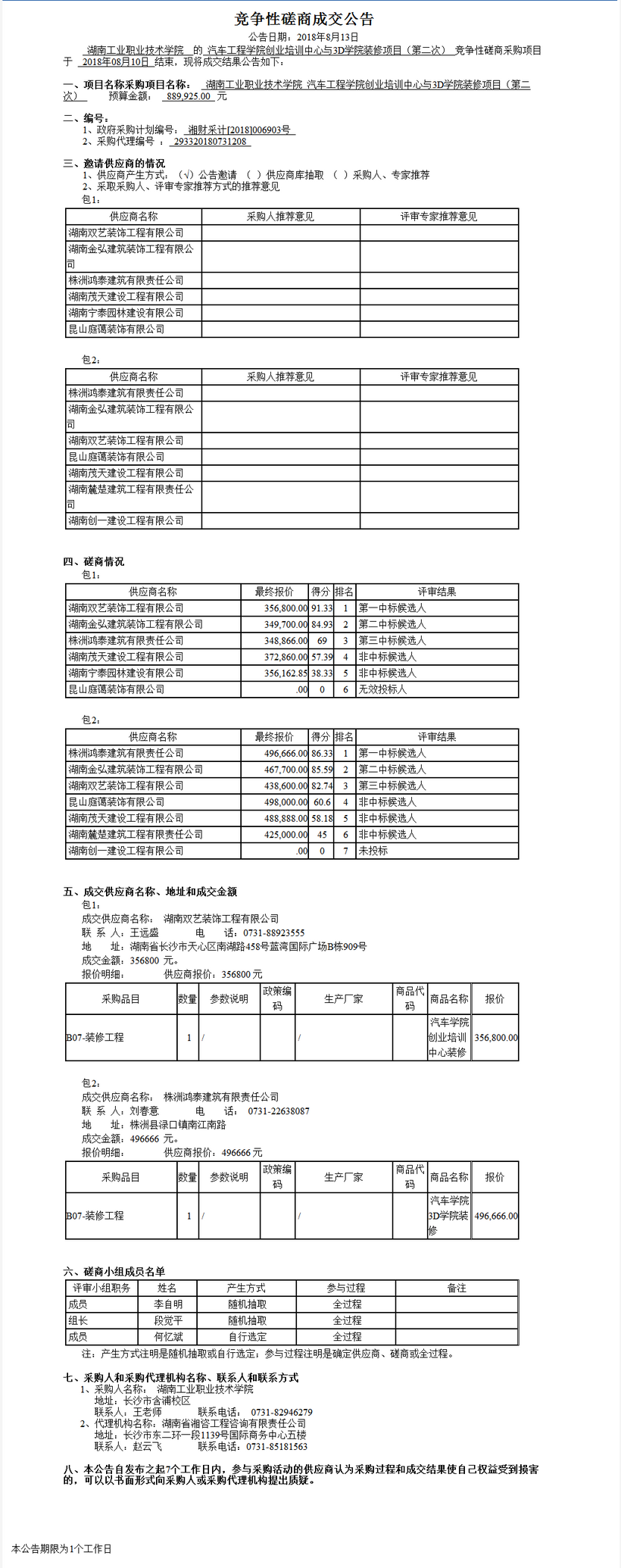 湖南工業(yè)職業(yè)技術(shù)學(xué)院汽車工程學(xué)院的創(chuàng)業(yè)培訓(xùn)中心和3D學(xué)院裝修工程項目(第二次)競爭性磋商成交公告