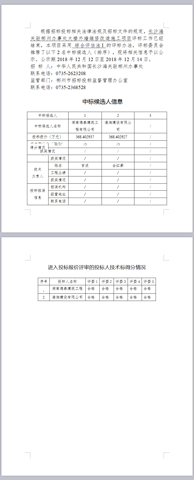 長(zhǎng)沙海關(guān)駐郴州辦事處大樓外墻維修改造施工項(xiàng)目中標(biāo)候選人公示