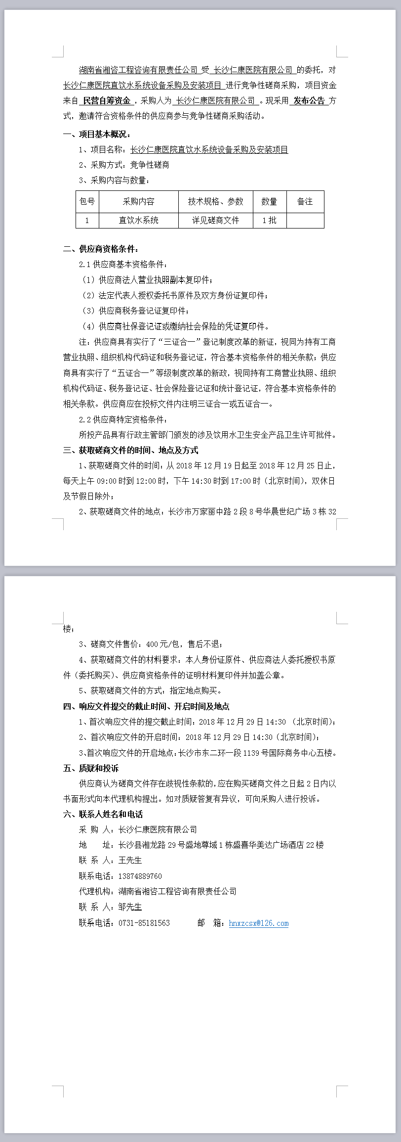 長沙仁康醫(yī)院直飲水系統(tǒng)設(shè)備采購及安裝項(xiàng)目磋商邀請公告