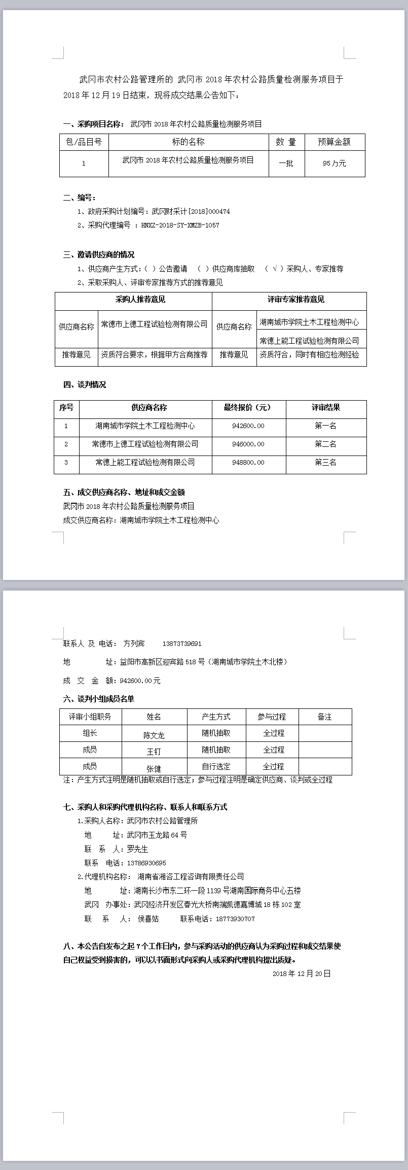 武岡市2018年農(nóng)村公路檢測服務(wù)項目采購競爭性談判成交結(jié)果公告