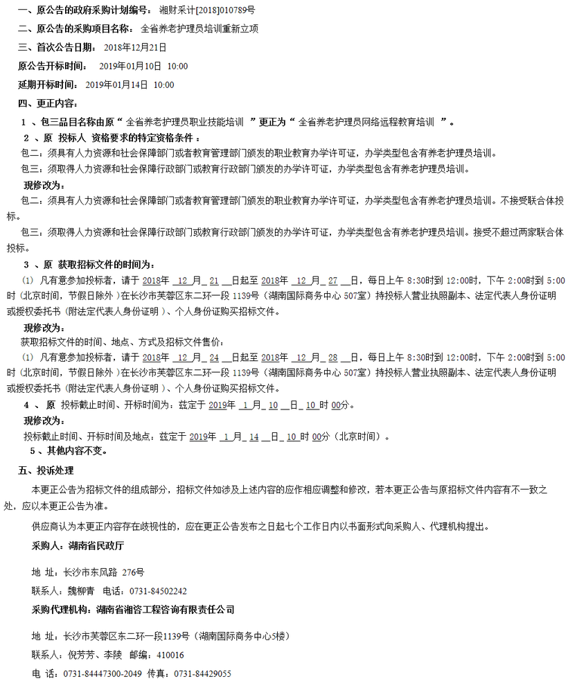 湖南省民政廳全省養(yǎng)老護(hù)理員培訓(xùn)重新立項(xiàng)項(xiàng)目公開招標(biāo)更正公告