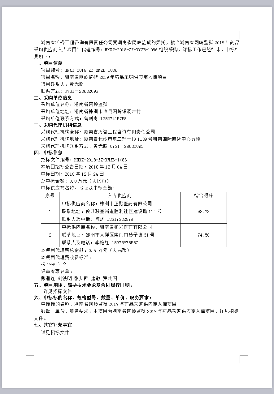 湖南省網(wǎng)嶺監(jiān)獄2019年藥品采購供應商入庫項目中標公告