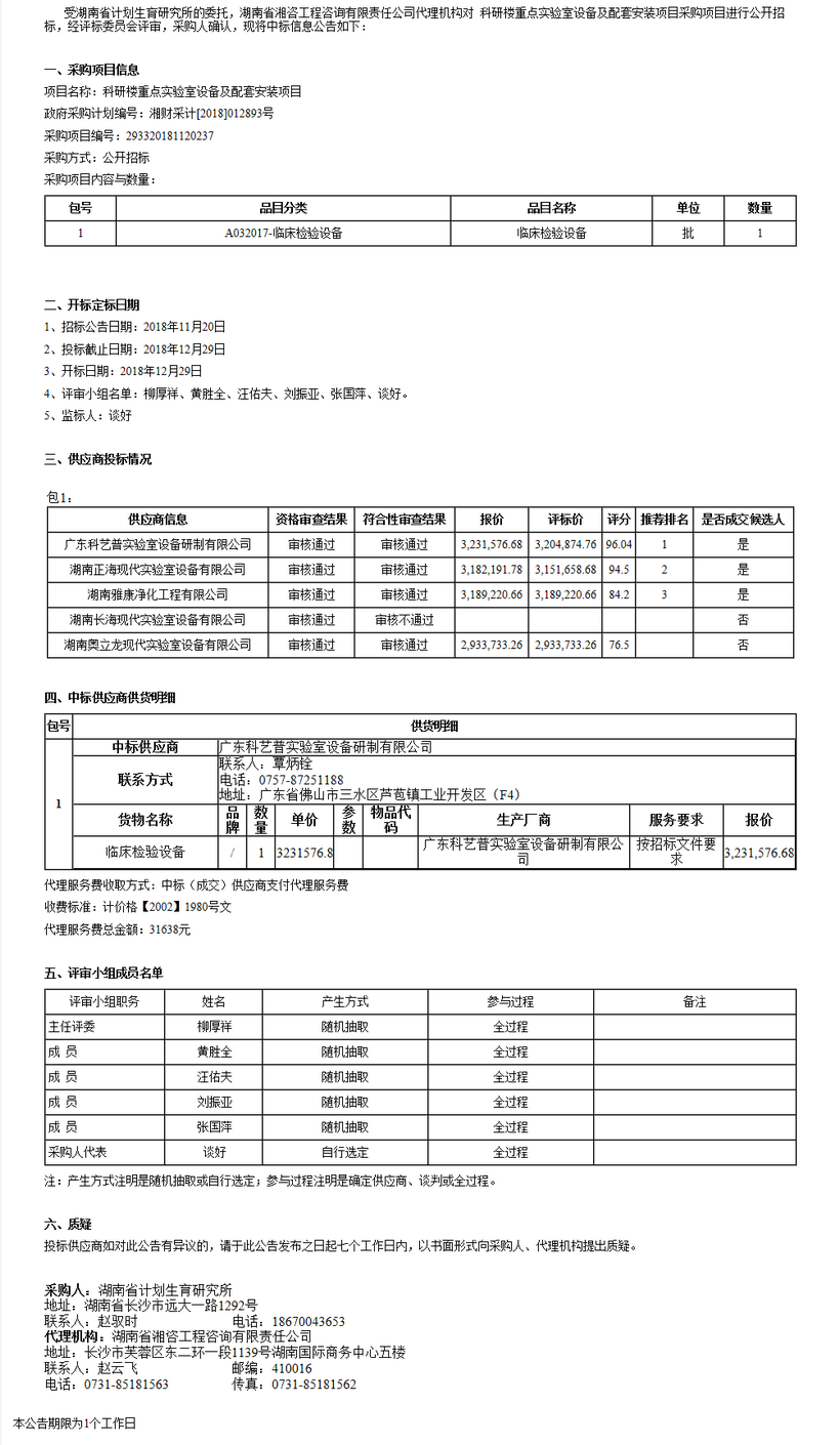 湖南省計劃生育研究所科研樓重點實驗室設(shè)備及配套安裝公開招標(biāo)中標(biāo)公告