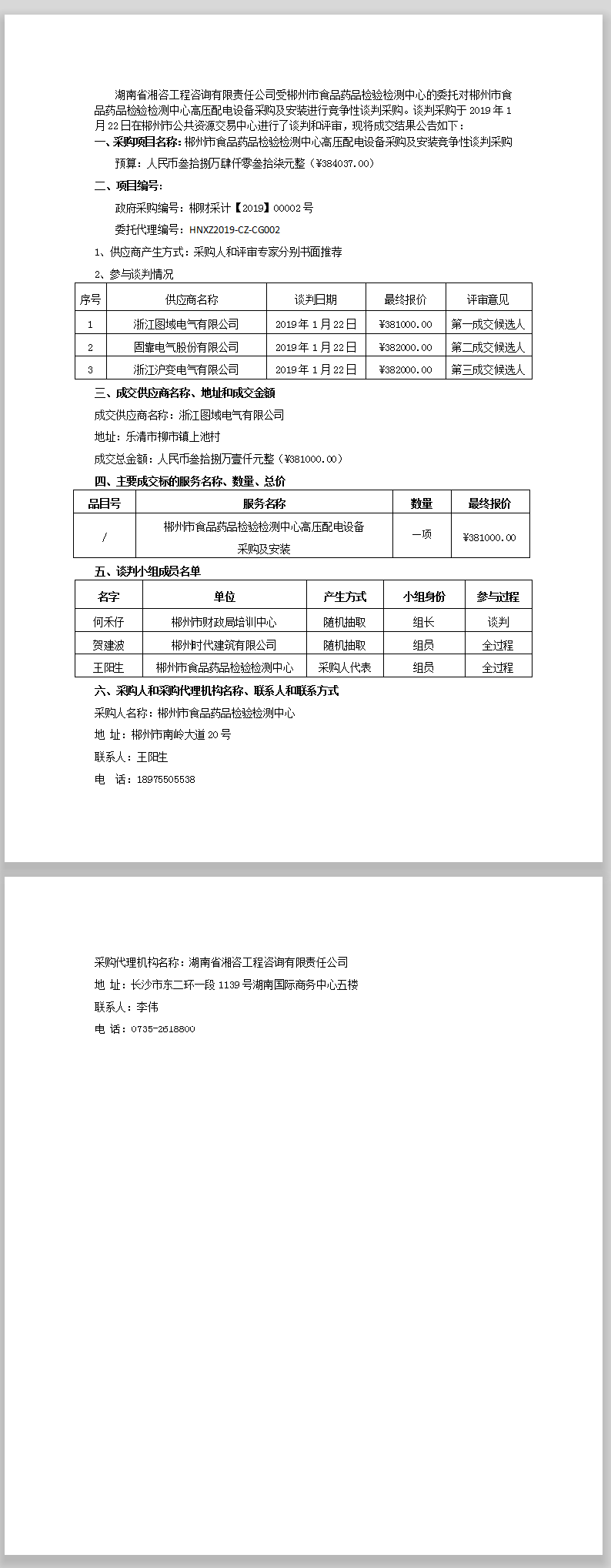 郴州市食品藥品檢驗檢測中心高壓配電設(shè)備采購及安裝 競爭性談判采購成交公告