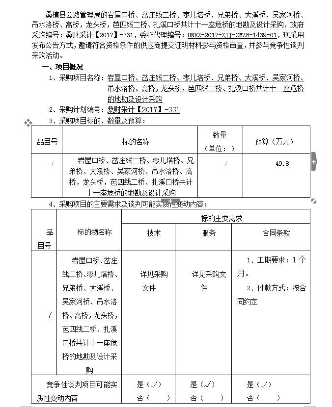 巖屋口橋、岔莊線二橋、棗兒塔橋、兄弟橋、大溪橋、吳家河橋、吊水洛橋、高橋,龍頭橋,芭四線二橋、扎溪口橋共計(jì)十一座危橋的地勘及設(shè)計(jì)采購 談判公告