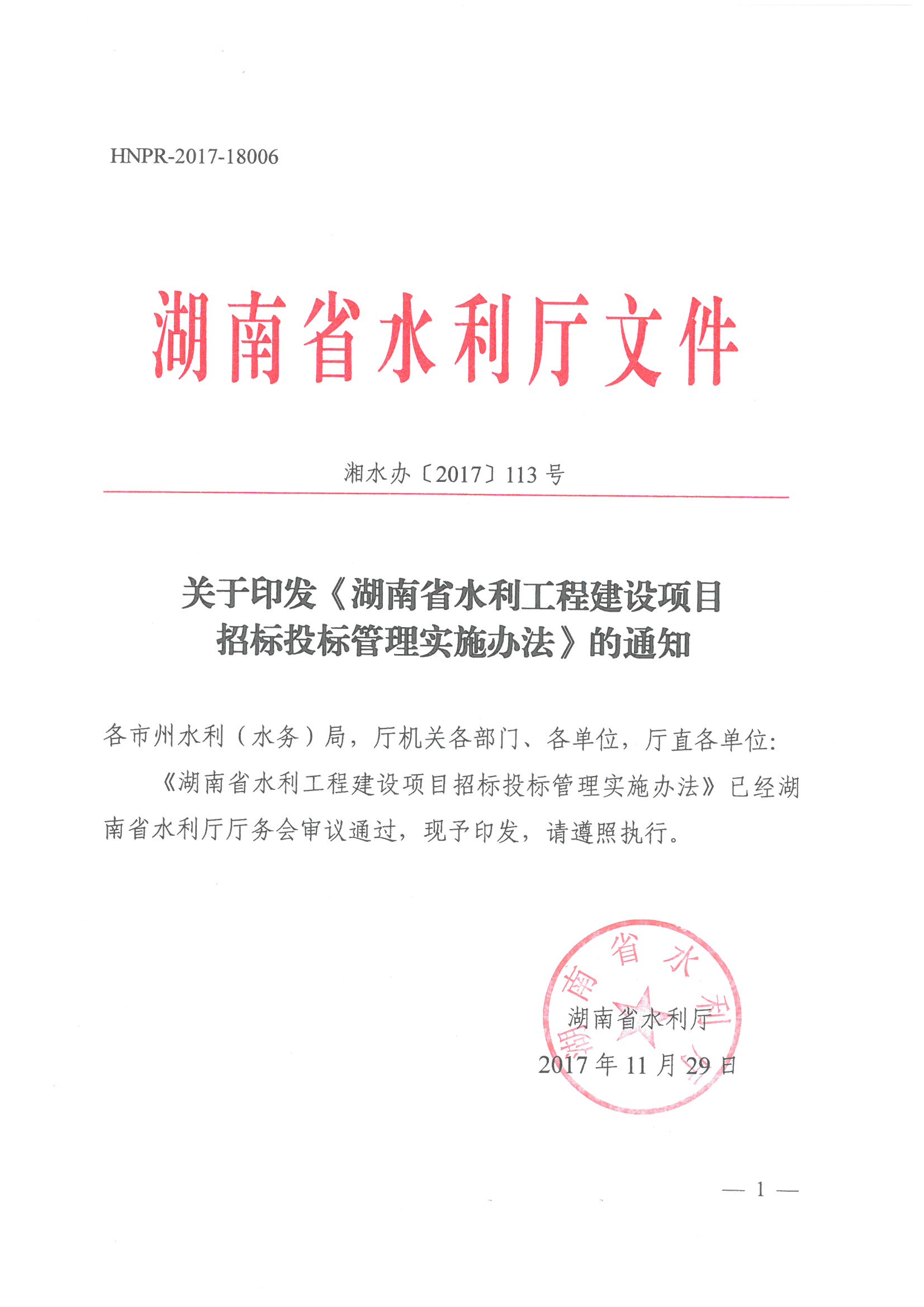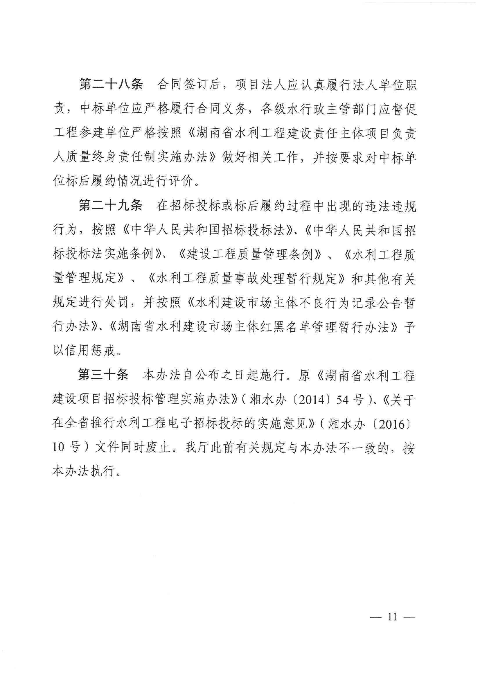 關于印發(fā)《湖南省水利工程建設項目招標投標管理實施辦法》的通知 湘水辦【2017】113號