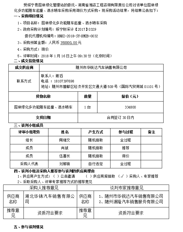園林綠化多功能隨車起重、灑水噴車采購(gòu)成交公告