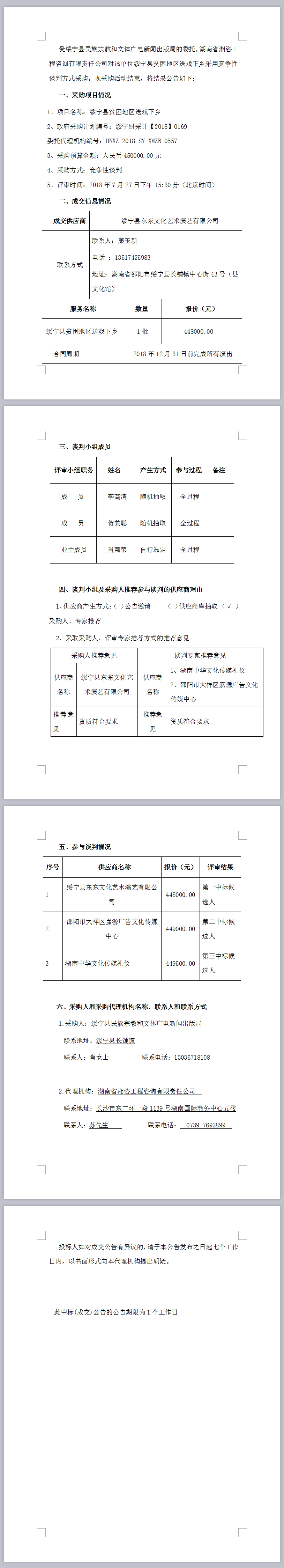 綏寧縣貧困地區(qū)送戲下鄉(xiāng)談判成交公告