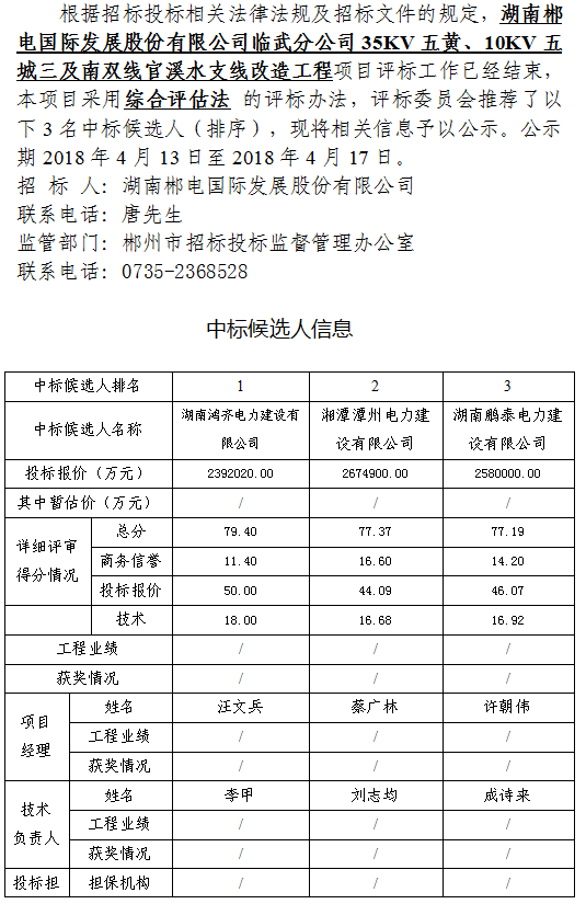 湖南郴電國(guó)際發(fā)展股份有限公司臨武分公司35KV五黃、10KV五城三及南雙線官溪水支線改造工程 中標(biāo)候選人公示