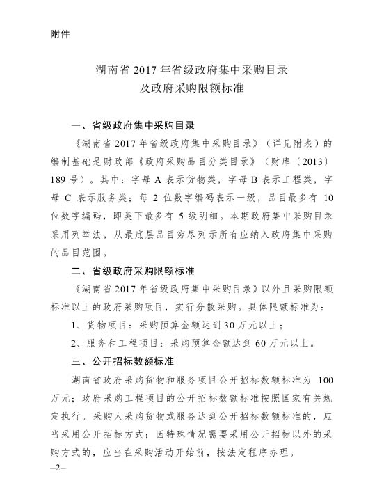湖南省財(cái)政廳關(guān)于印發(fā)《湖南省2017年省級(jí)政府集中采購(gòu)目錄以及政府采購(gòu)限額標(biāo)準(zhǔn)》的通知