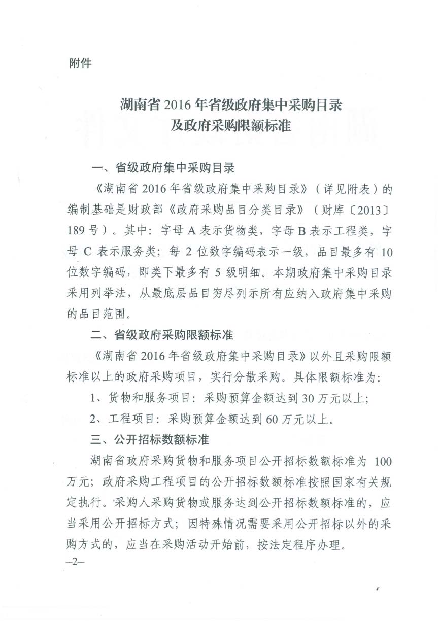 湖南省財政廳關(guān)于印發(fā)《湖南省2016年省級政府集中采購目錄及政府采購限額標準》的通知