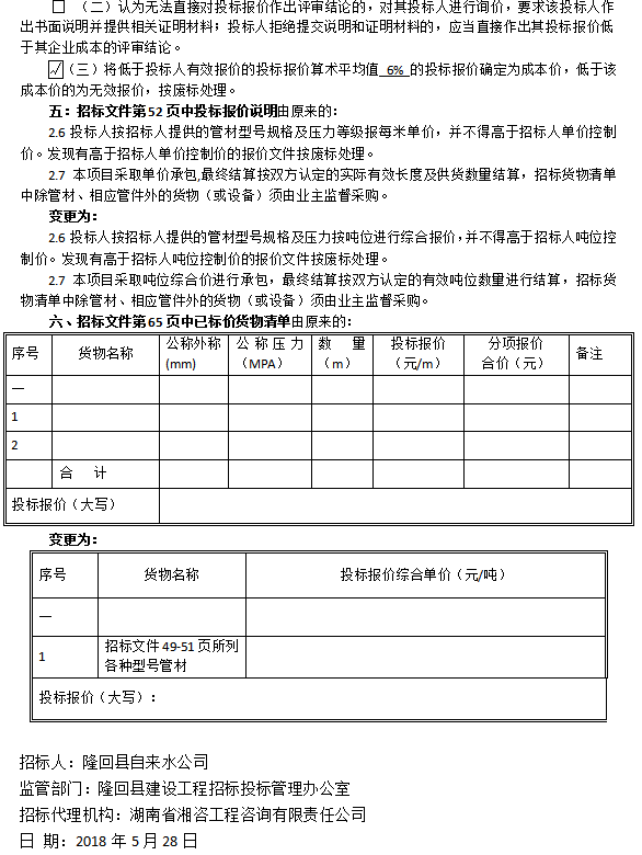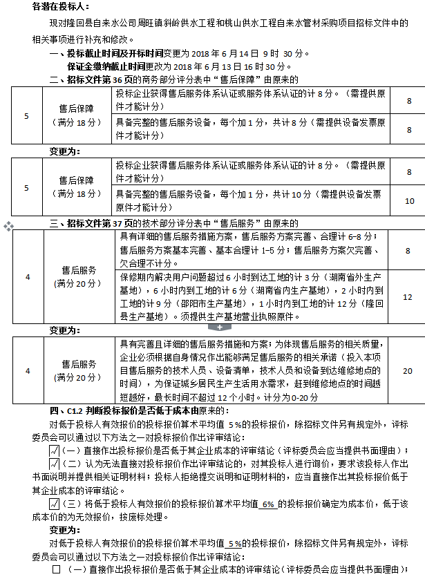 隆回縣自來水公司周旺鎮(zhèn)斜嶺供水工程和桃山供水工程 自來水管材采購項目招標(biāo)文件修改及延期公告