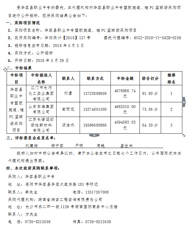 華容縣職業(yè)中專塑膠跑道、硅PU籃球場采購項(xiàng)目公開招標(biāo)中標(biāo)公告