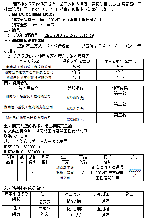 神農(nóng)灣酒店建設(shè)項(xiàng)目800kVA增容配電工程建筑項(xiàng)目 競(jìng)爭(zhēng)性談判成交公告