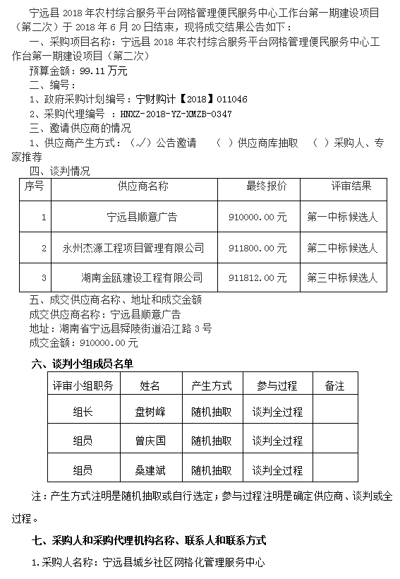 寧遠縣2018年農(nóng)村綜合服務(wù)平臺網(wǎng)格管理便民服務(wù)中心工作臺第一期建設(shè)項目(第二次)競爭性談判成交結(jié)果公告