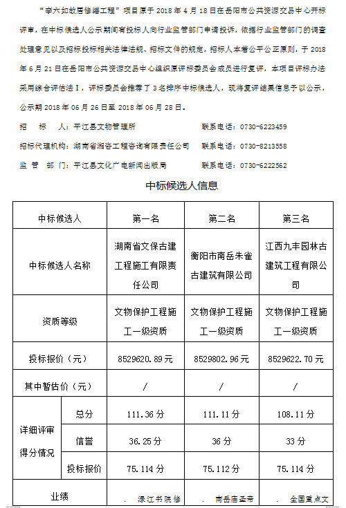 李六如故居修繕工程項(xiàng)目中標(biāo)候選人復(fù)評(píng)公示