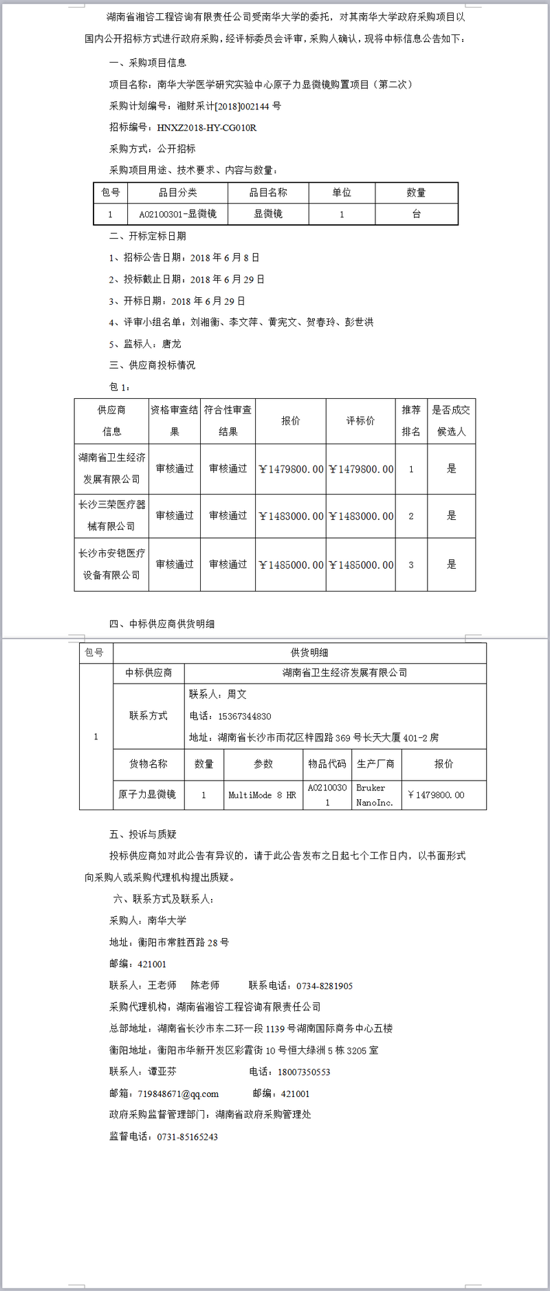 南華大學(xué)醫(yī)學(xué)研究實(shí)驗(yàn)中心原子力顯微鏡購(gòu)置項(xiàng)目(第二次)中標(biāo)公告