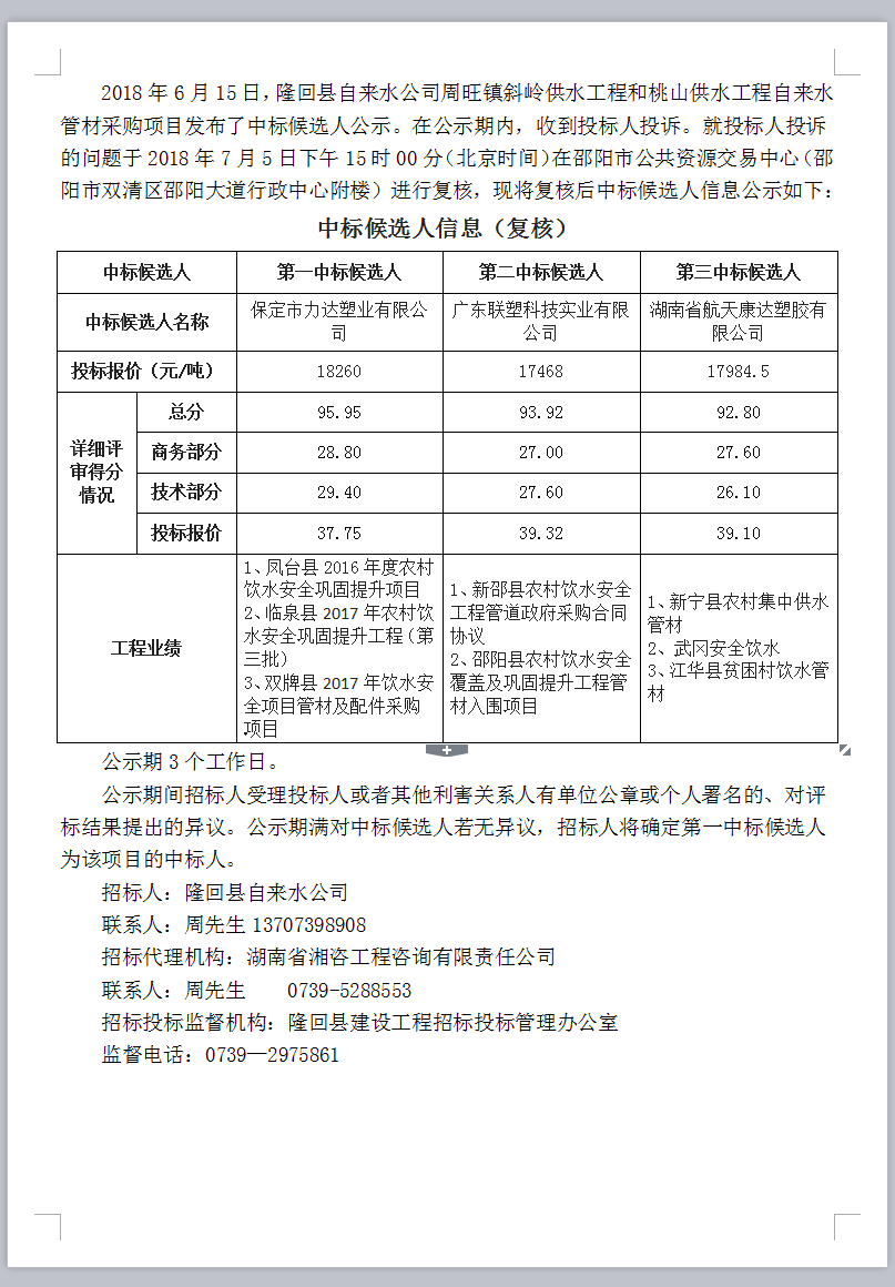 隆回縣自來水公司周旺鎮(zhèn)斜嶺供水工程和桃山供水工程自來水管材采購項目招標投標信息公示表(復核)