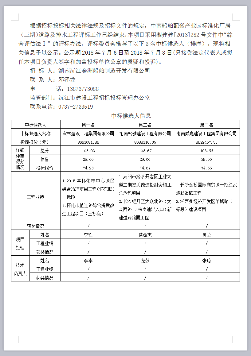 中南船舶配套產(chǎn)業(yè)園標(biāo)準(zhǔn)化廠房(三期)道路及排水工程中標(biāo)候選人公示