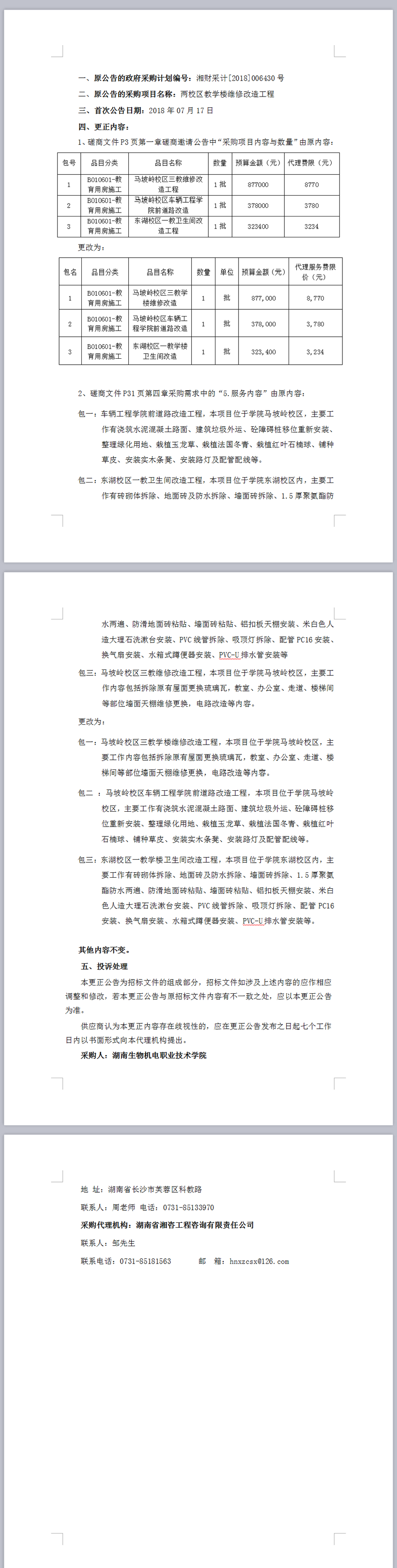湖南生物機(jī)電職業(yè)技術(shù)學(xué)院兩校區(qū)教學(xué)樓維修改造工程項(xiàng)目競爭性磋商更正公告