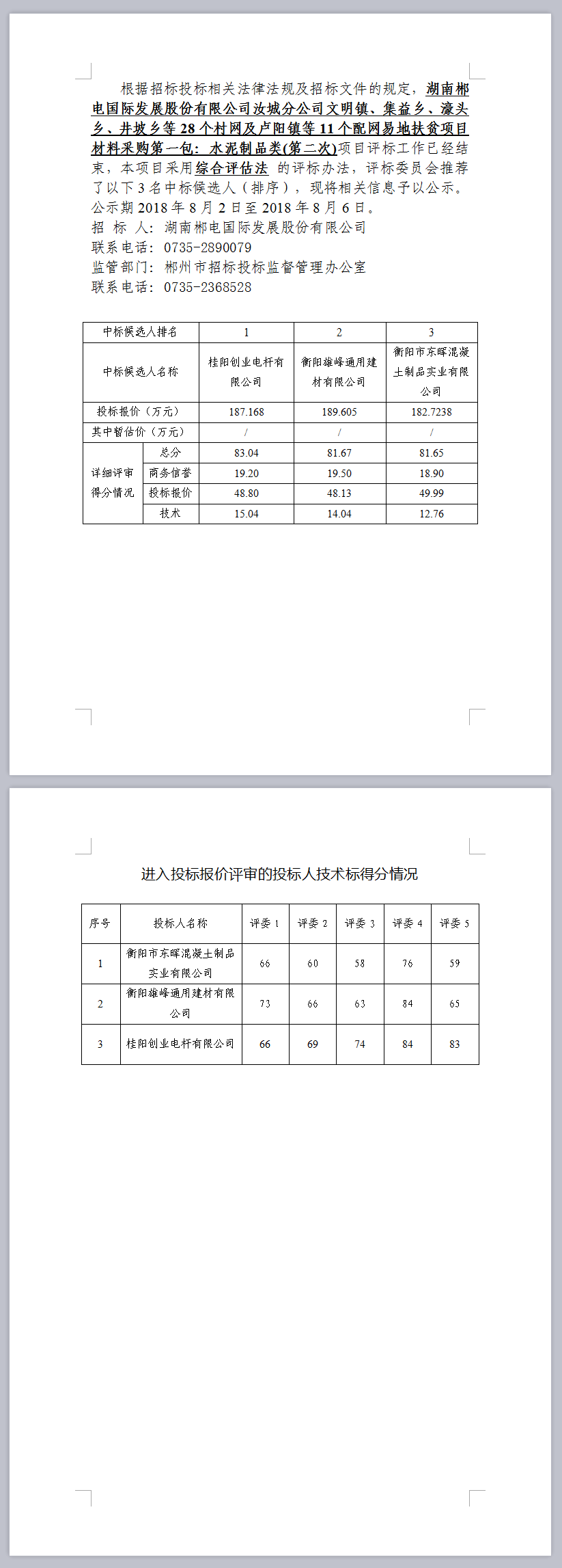 湖南郴電國際發(fā)展股份有限公司汝城分公司文明鎮(zhèn)、集益鄉(xiāng)、濠頭鄉(xiāng)、井坡鄉(xiāng)等28個村網(wǎng)及盧陽鎮(zhèn)等11個配網(wǎng)易地扶貧項目材料采購第一包:水泥制品類(第二次)中標候選人公示