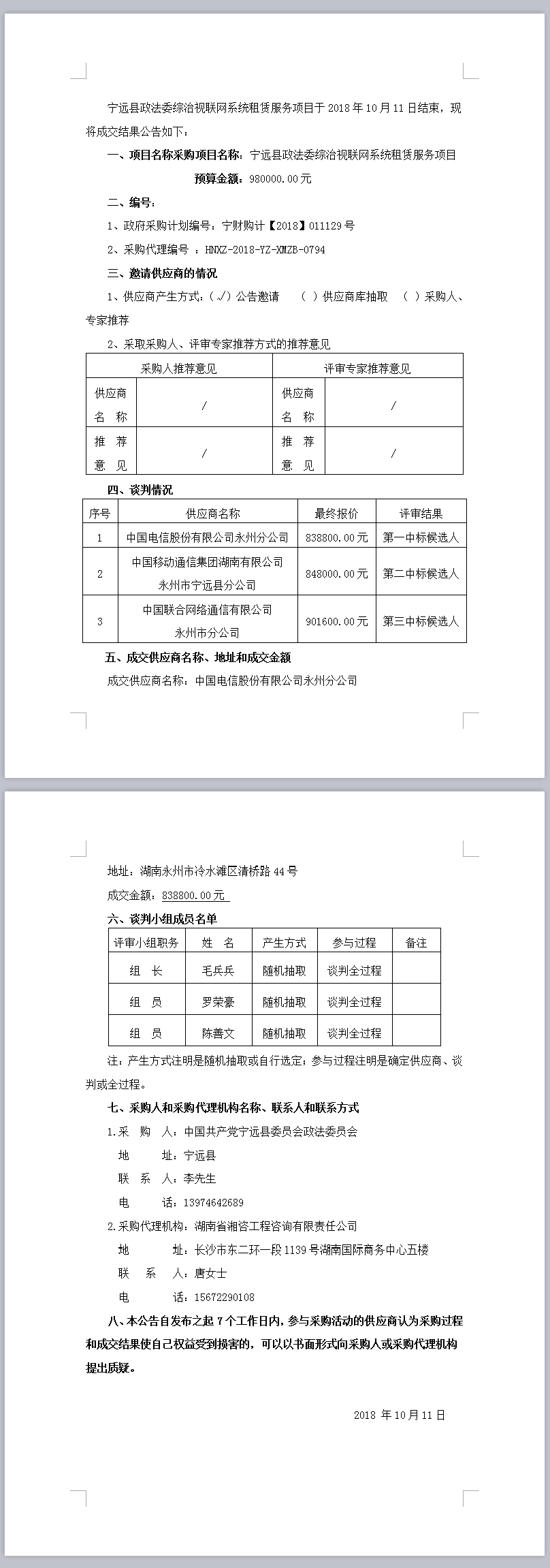 寧遠(yuǎn)縣政法委綜治視聯(lián)網(wǎng)系統(tǒng)租賃服務(wù)項(xiàng)目 競(jìng)爭(zhēng)性談判成交結(jié)果公告