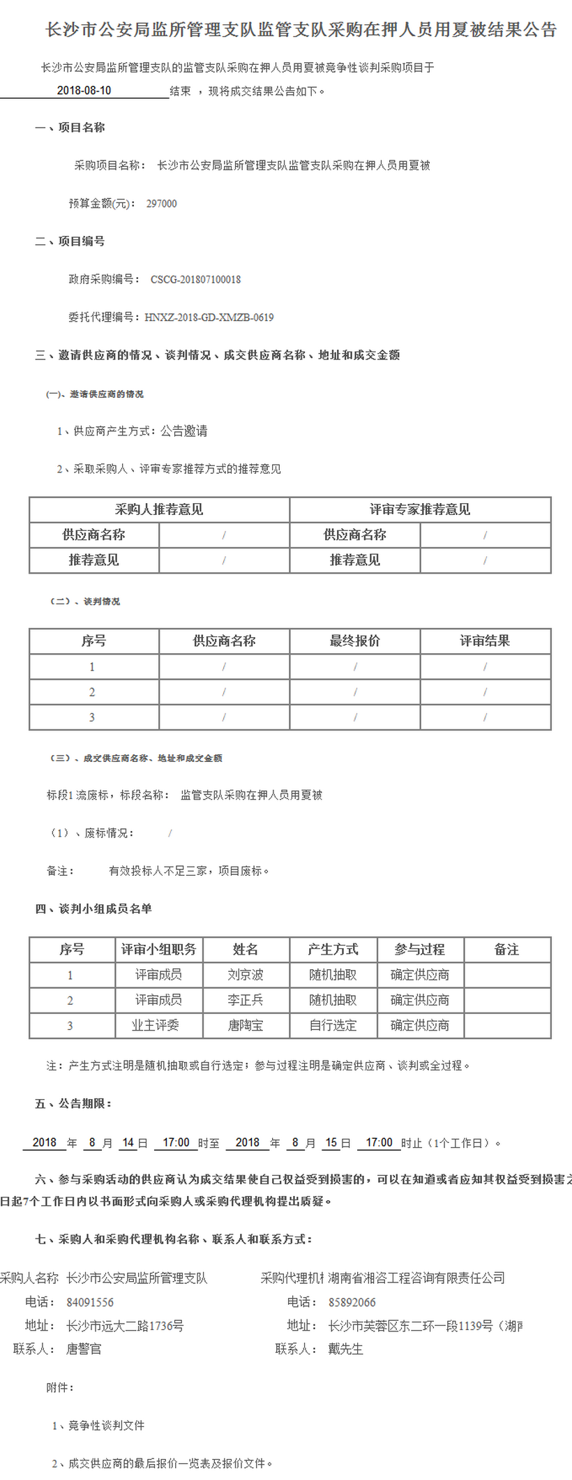 長沙市公安局監(jiān)所管理支隊監(jiān)管支隊采購在押人員用夏被結(jié)果公告