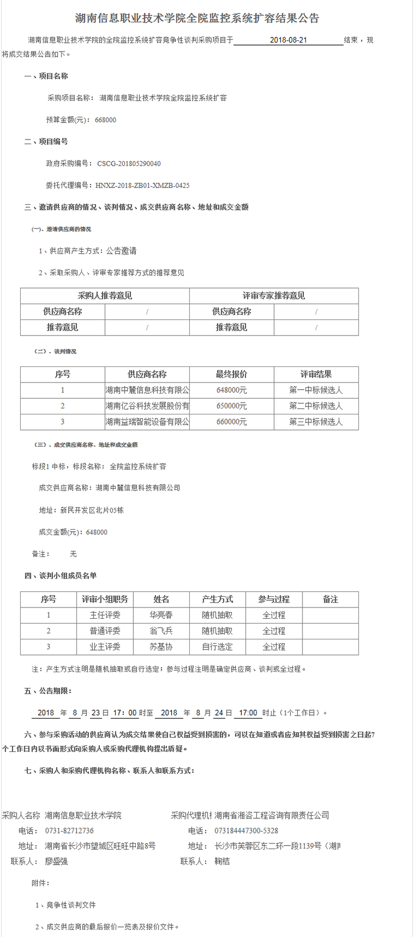 湖南信息職業(yè)技術(shù)學(xué)院全院監(jiān)控系統(tǒng)擴(kuò)容結(jié)果公告