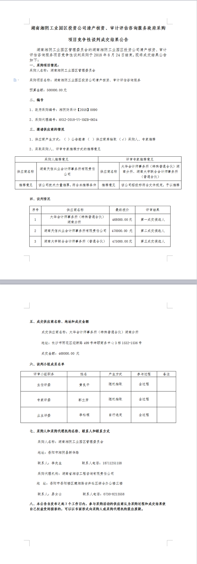 湖南湘陰工業(yè)園區(qū)投資公司清產(chǎn)核資、審計(jì)評(píng)估咨詢服務(wù)政府采購 項(xiàng)目競爭性談判成交結(jié)果公告