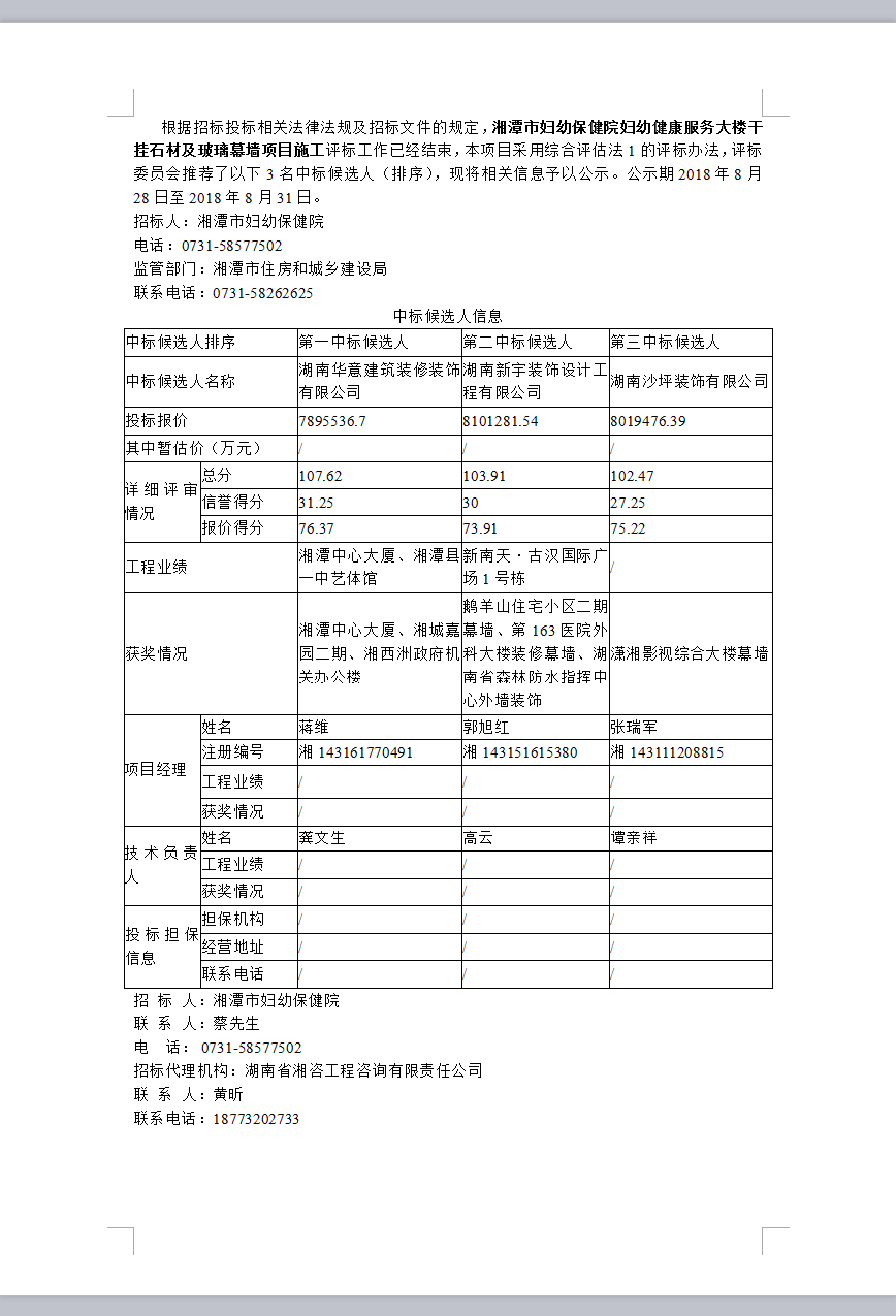 湘潭市婦幼保健院婦幼健康服務(wù)大樓干掛石材及玻璃幕墻項目施工中標(biāo)候選人公示