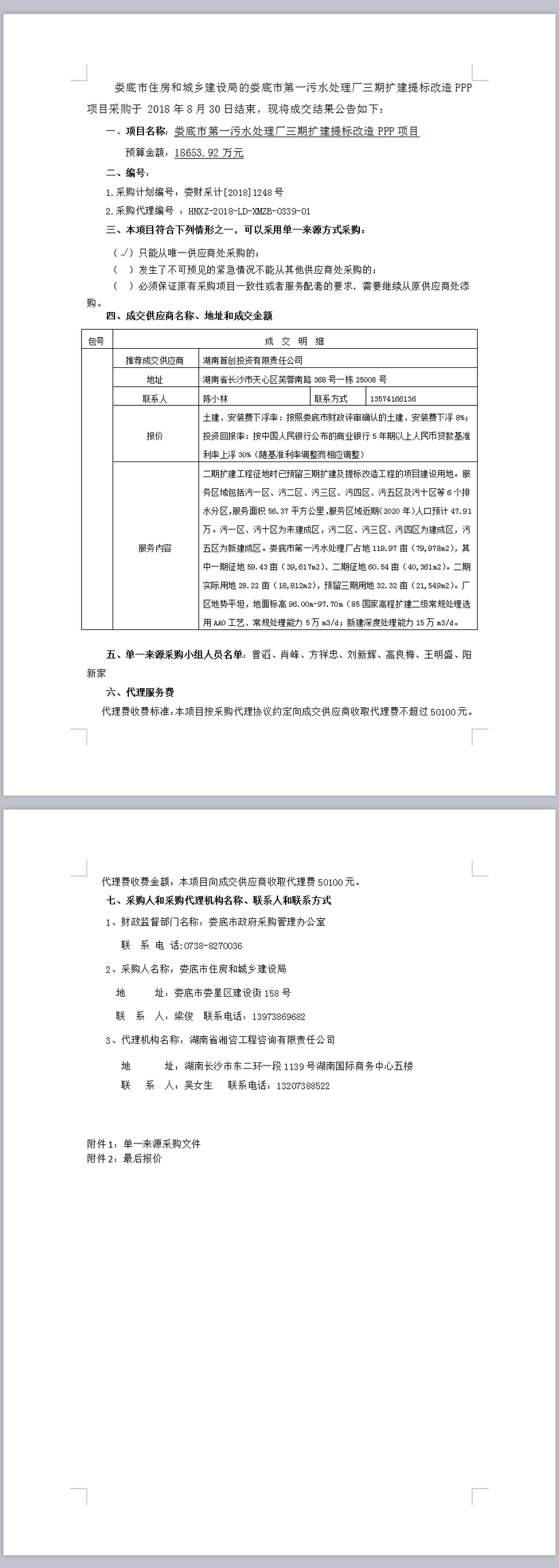 婁底市第一污水處理廠三期擴建及提標改造PPP項目單一來源成交公告
