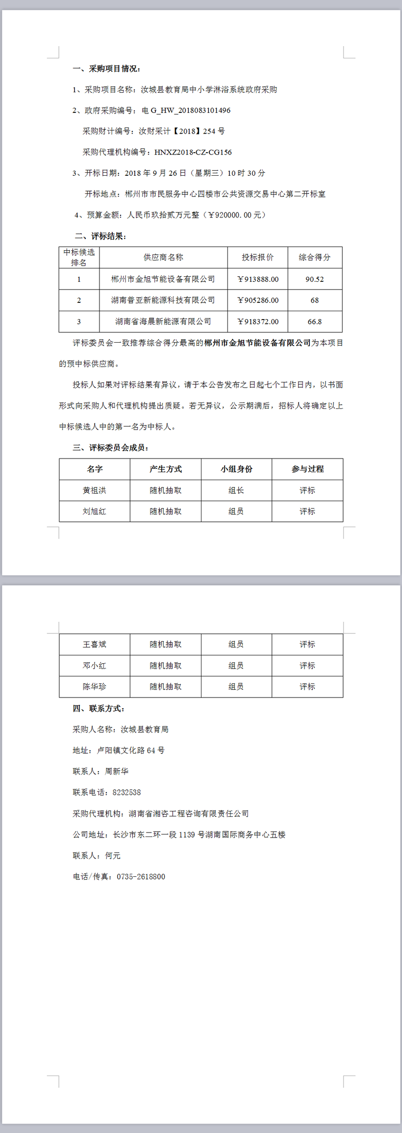 汝城縣教育局中小學(xué)淋浴系統(tǒng)政府采購中標(biāo)結(jié)果公示