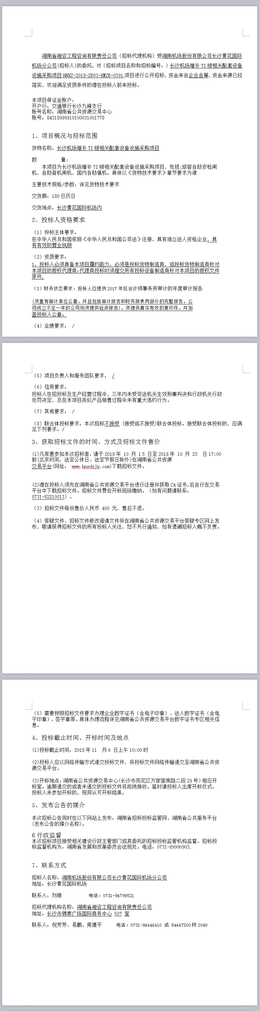 長(zhǎng)沙機(jī)場(chǎng)增補(bǔ)TI樓相關(guān)配套設(shè)備設(shè)施采購(gòu) 項(xiàng)目招標(biāo)公告(重新招標(biāo))