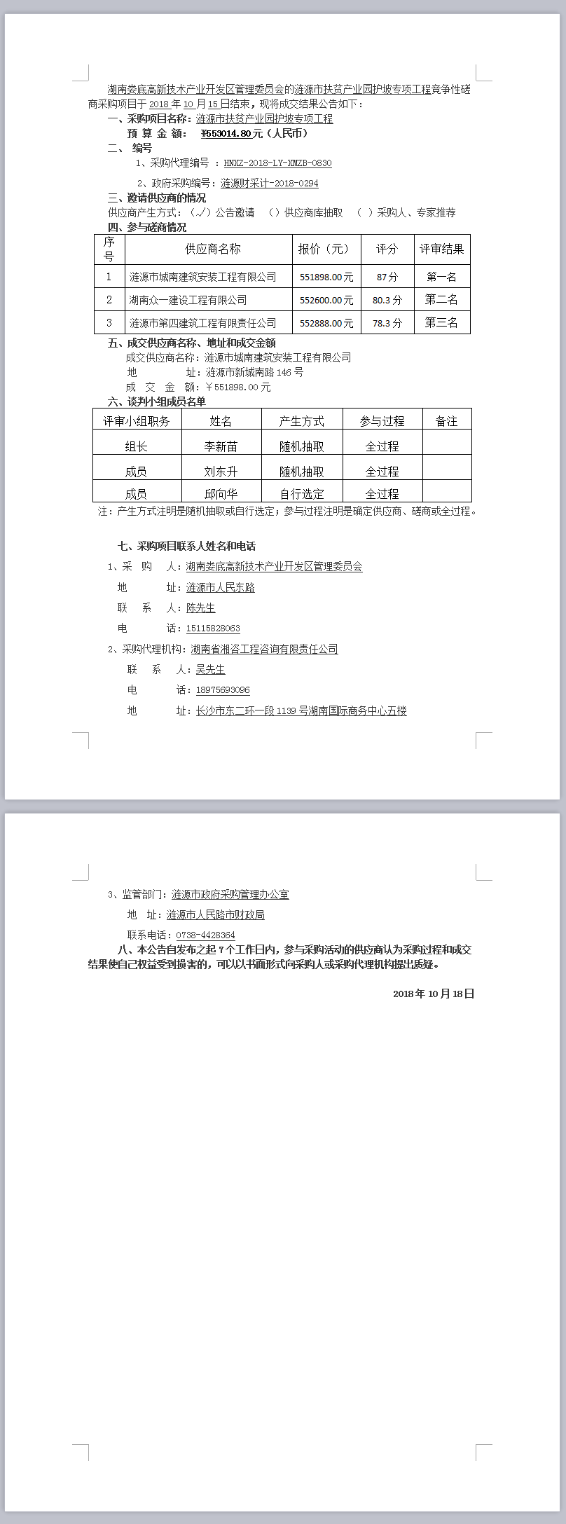 漣源市扶貧產業(yè)園護坡專項工程 競爭性磋商成交結果公告