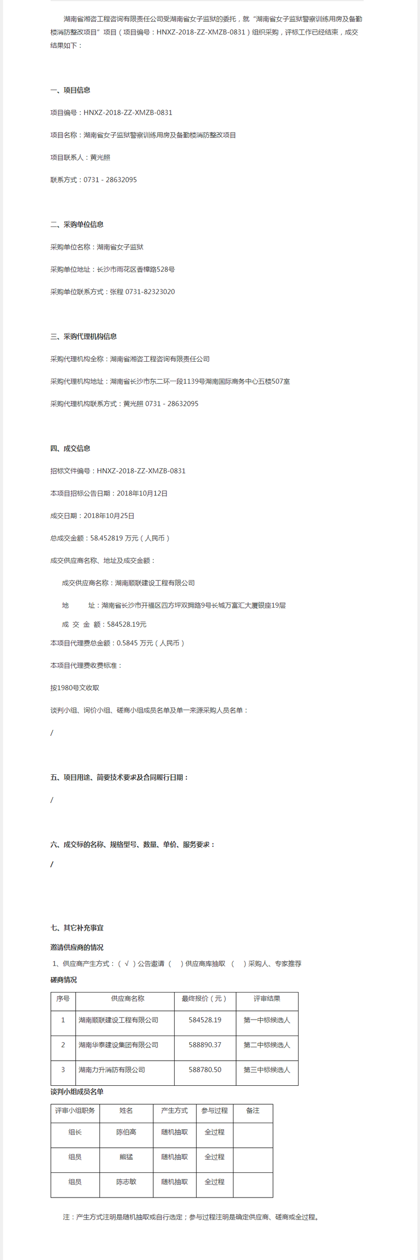 湖南省女子監(jiān)獄警察訓(xùn)練用房及備勤樓消防整改項(xiàng)目成交結(jié)果公告