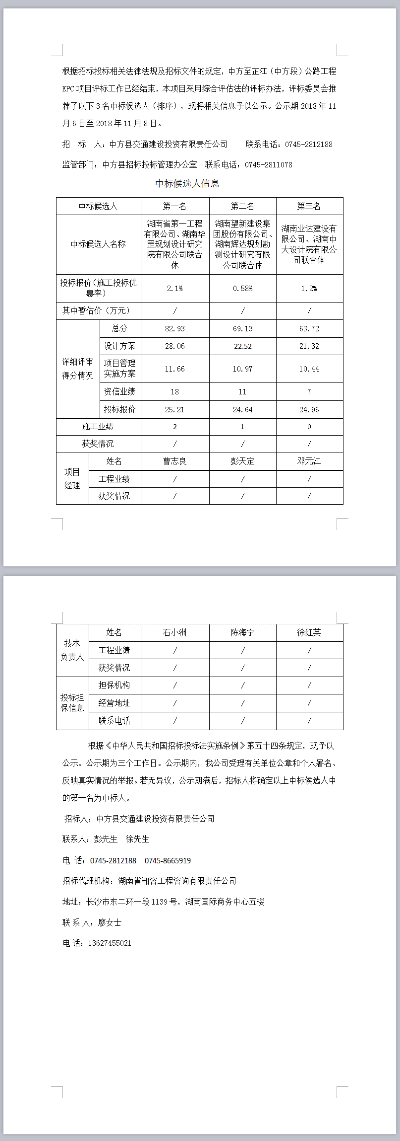 中方至芷江(中方段)公路工程EPC項目中標(biāo)候選人公示