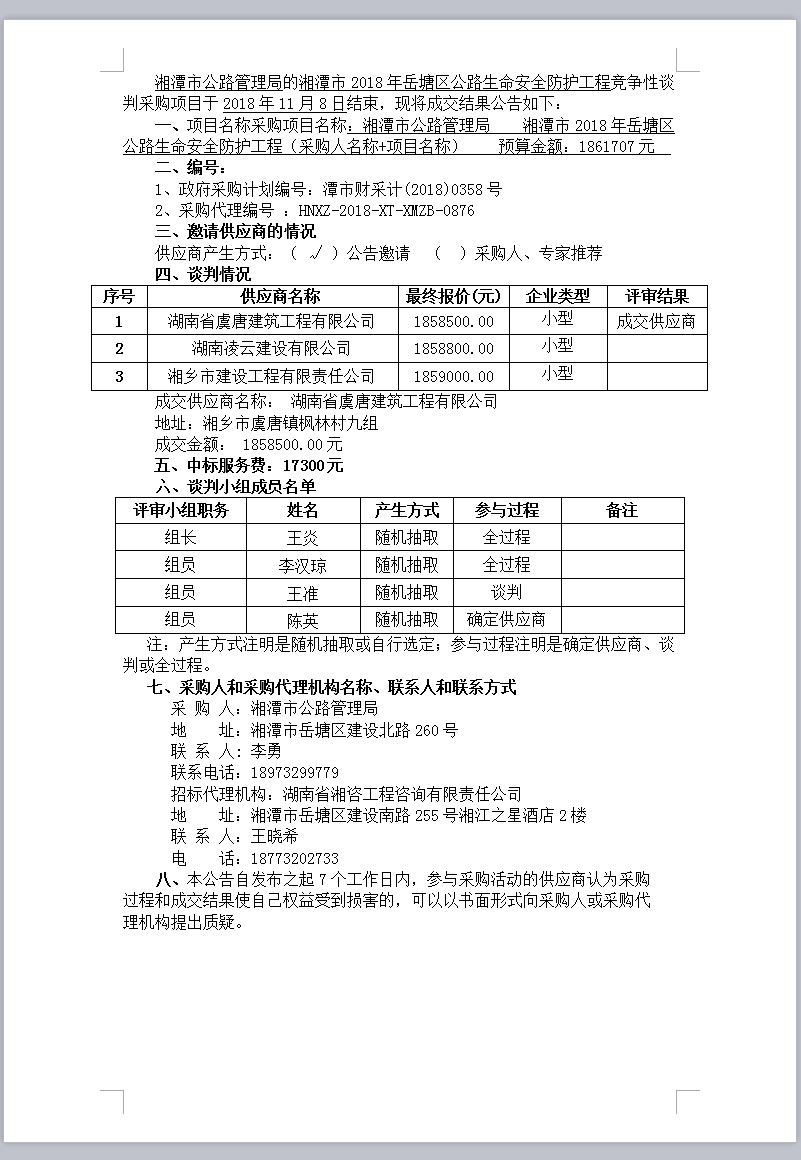 湘潭市2018年岳塘區(qū)公路生命安全防護(hù)工程競(jìng)爭(zhēng)性談判成交結(jié)果公告