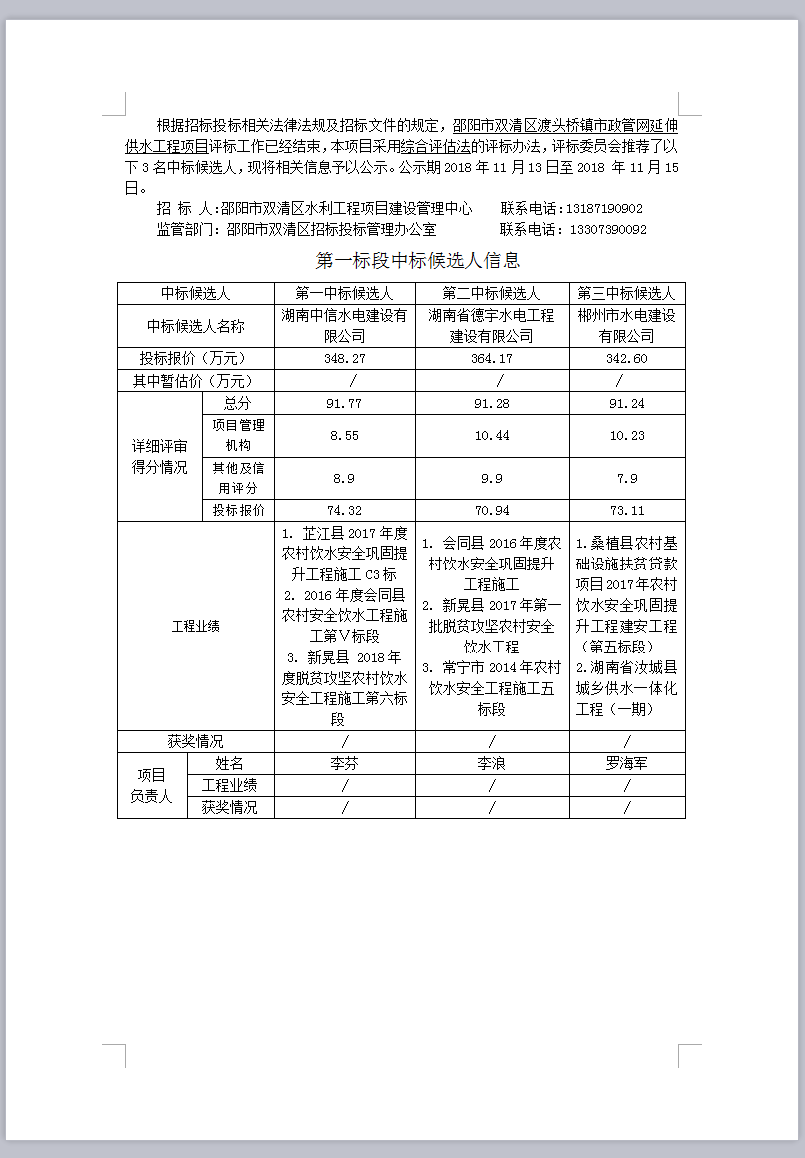 邵陽(yáng)市雙清區(qū)渡頭橋鎮(zhèn)市政管網(wǎng)延伸供水工程項(xiàng)目 招標(biāo)投標(biāo)信息公示表