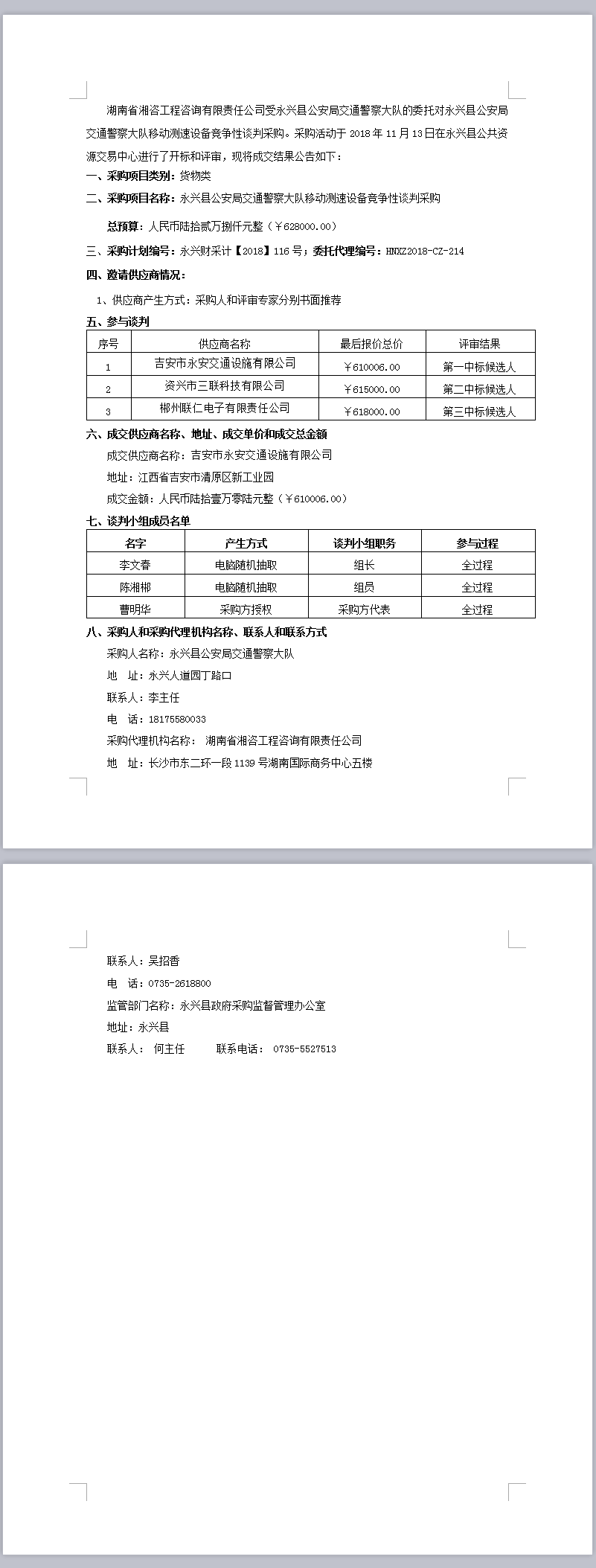 永興縣公安局交通警察大隊移動測速設備競爭性談判采購成交公告