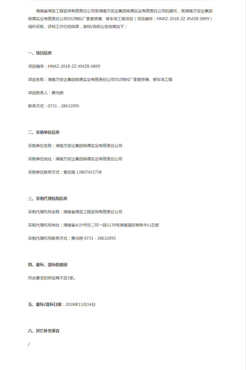 湖南萬(wàn)安達(dá)集團(tuán)銘德實(shí)業(yè)有限責(zé)任公司502飼料廠食堂修繕、停車場(chǎng)工程廢標(biāo)公告/流標(biāo)公告