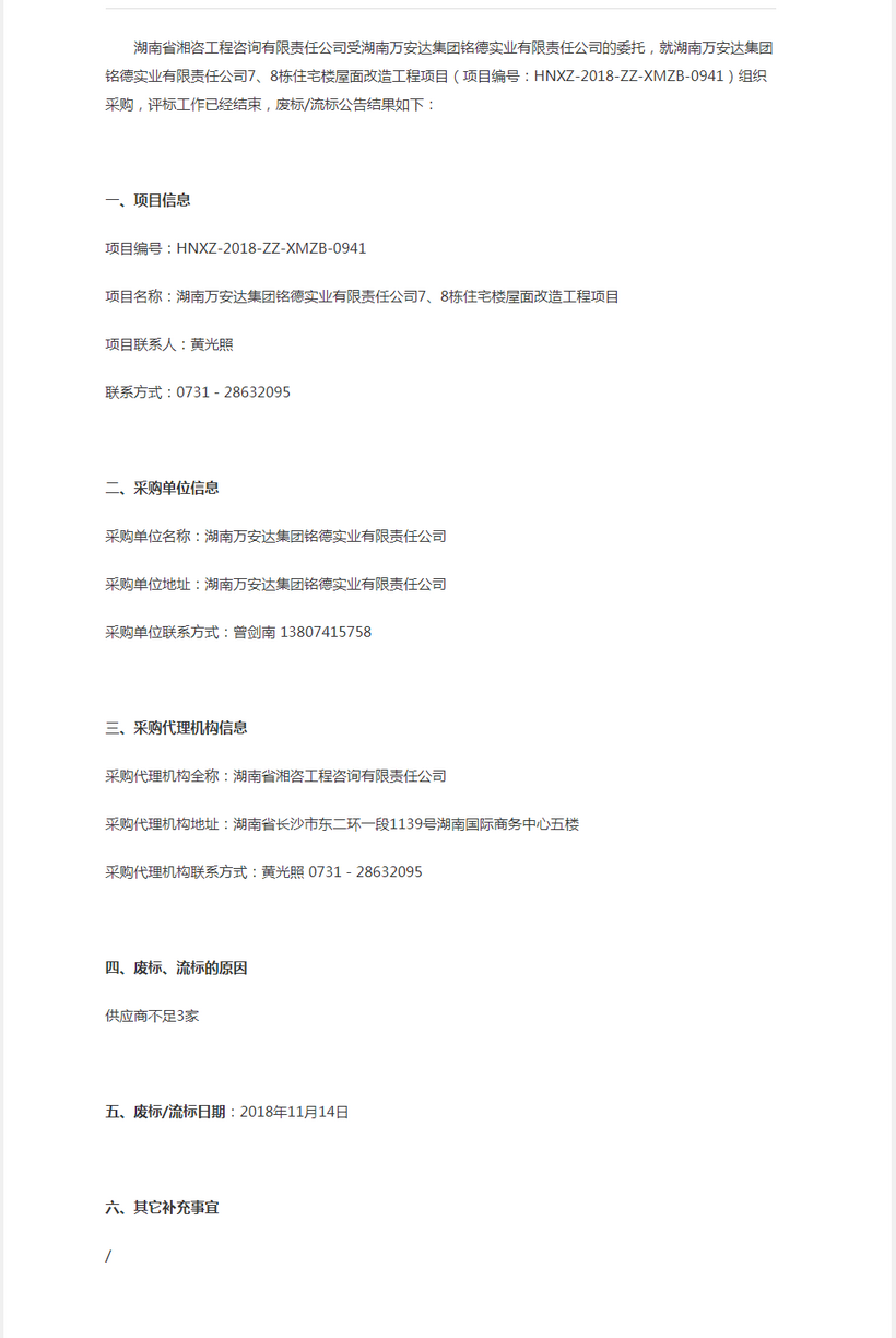 湖南萬(wàn)安達(dá)集團(tuán)銘德實(shí)業(yè)有限責(zé)任公司7、8棟住宅樓屋面改造工程項(xiàng)目廢標(biāo)公告/流標(biāo)公告