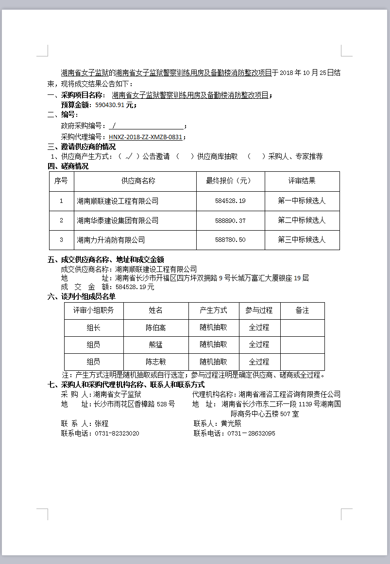湖南省女子監(jiān)獄警察訓(xùn)練用房及備勤樓消防整改項(xiàng)目成交結(jié)果公告
