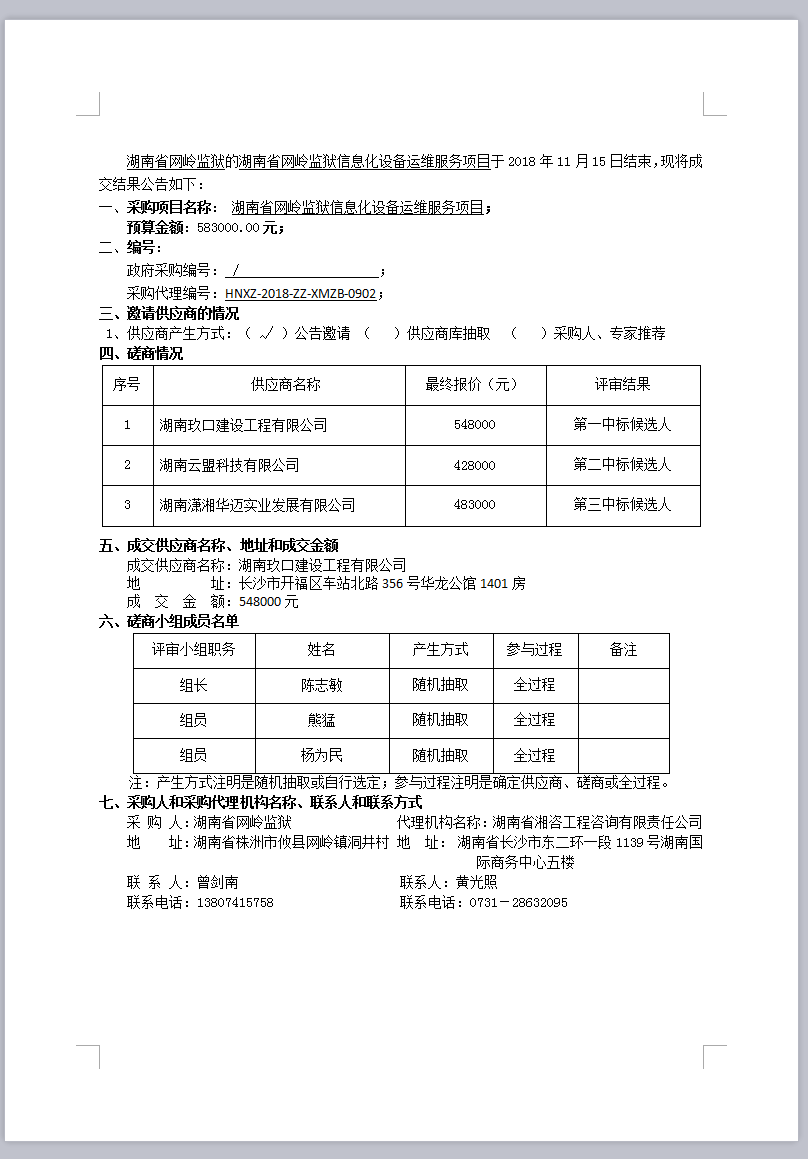 湖南省網(wǎng)嶺監(jiān)獄信息化設(shè)備運(yùn)維服務(wù)項(xiàng)目成交結(jié)果公告