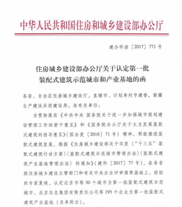 為貫徹落實《中共中央 國務(wù)院關(guān)于進(jìn)一步加強城市規(guī)劃建設(shè)管理工作的若干意見》和《國務(wù)院辦公廳關(guān)于大力發(fā)展裝配式建筑的指導(dǎo)意見》(國辦發(fā)[2016] 71 號)精神,積極推進(jìn)裝配式建筑發(fā)展,根據(jù)《住房城鄉(xiāng)建設(shè)部關(guān)于印發(fā)〈"十三五"裝配式建筑行動方案〉〈裝配式建筑示范城市管理辦法〉〈裝配式建筑產(chǎn)業(yè)基地管理辦法〉的通知》 (建科[2017] 77 號) ,在各省級住房城鄉(xiāng)建設(shè)主管部門和有關(guān)中央企業(yè)評審?fù)扑]基礎(chǔ)上,經(jīng)組織專家復(fù)核,認(rèn)定北京市等30 個城市為第一批裝配式建筑示范城市,北京住總集團(tuán)有限責(zé)任公司等195 個企業(yè)為第一批裝配式建筑產(chǎn)業(yè)基地(名單附后)。