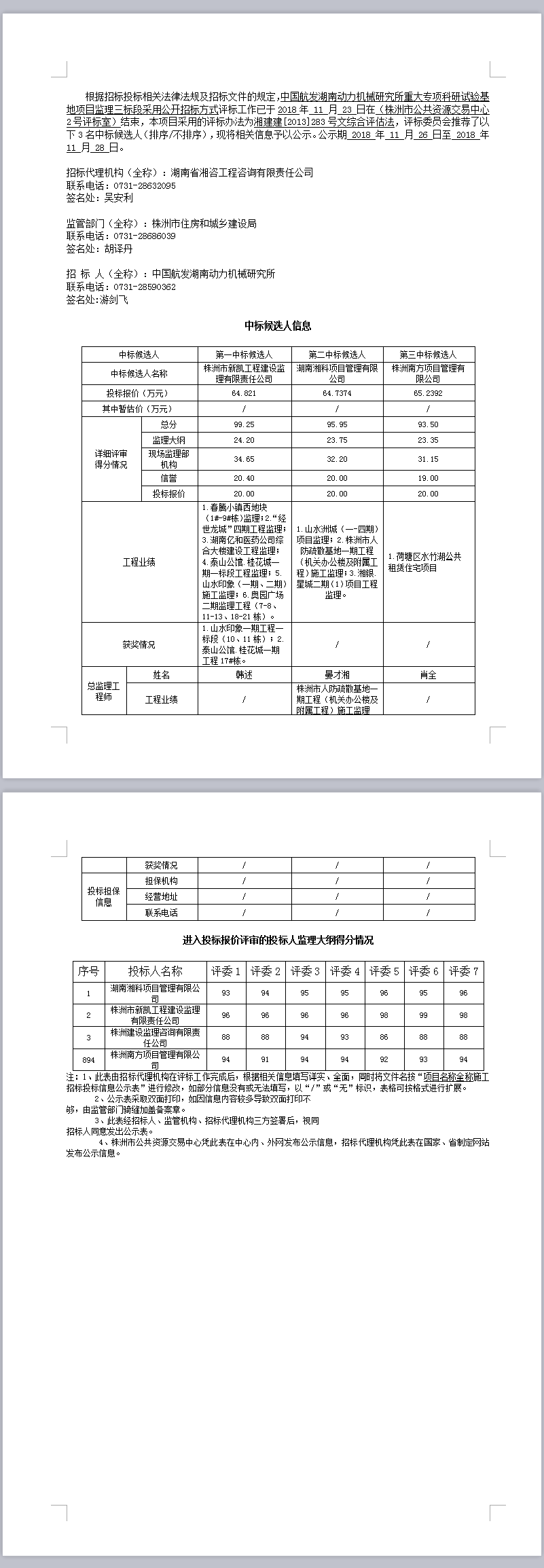 中國航發(fā)湖南動(dòng)力機(jī)械研究所重大專項(xiàng)科研試驗(yàn)基地項(xiàng)目監(jiān)理三標(biāo)段招標(biāo)投標(biāo)信息公示表